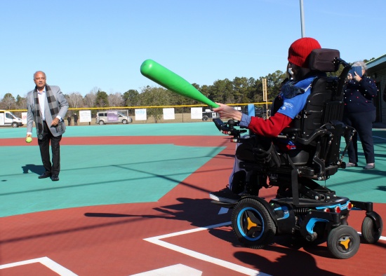Rotary International President Shekhar Mehta pitches to Rotarian David Morrison (a former member of this club) at Wilmington's Miracle Field on Jan. 12, 2022. Several area Rotary clubs, including this one, have provided support for the facility, which provides inclusive recreational opportunities for athletes with disabilities.